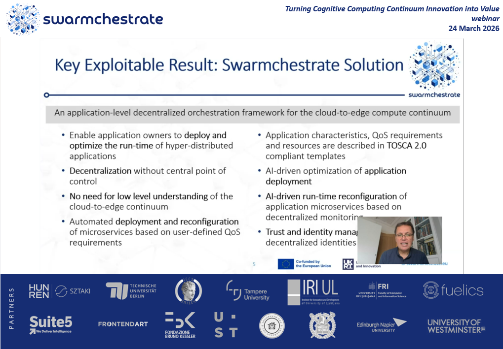 On March 24, 2026, the Swarmchestrate project took center stage at the joint webinar “Turning Cognitive Computing Continuum Innovation into Value”. Our Project Technical Lead, Prof. Tamas Kiss of the University of Westminster, presented our primary Key Exploitable Result (KER)—the Swarmchestrate Solution.